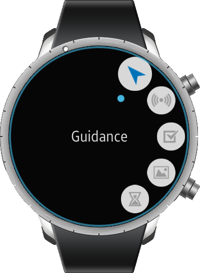 This screen displays the main menu of the application which is accessed by rotating the bezel of the watch.