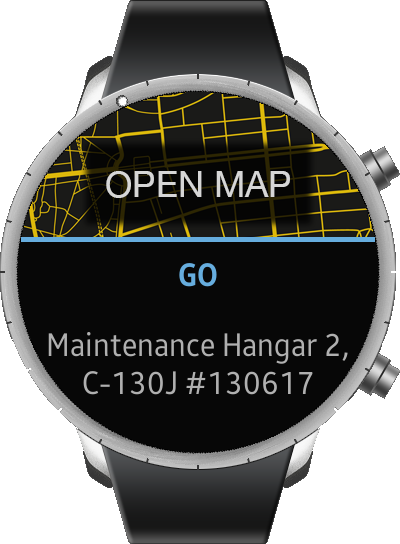 This screen shows a 'go' micro-form instruction which directs the user to travel to an aircraft hangar. Clicking the 'open map' button on top would redirect the user to Google Maps.