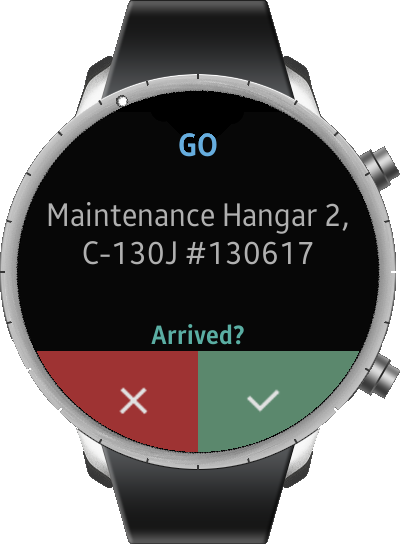 Having arrived at the aircraft hangar, the user would confirm their arrival. If there was an issue along the way, the user could tap the X button which would prompt them to describe the issue they were facing and re-task them appropriately.